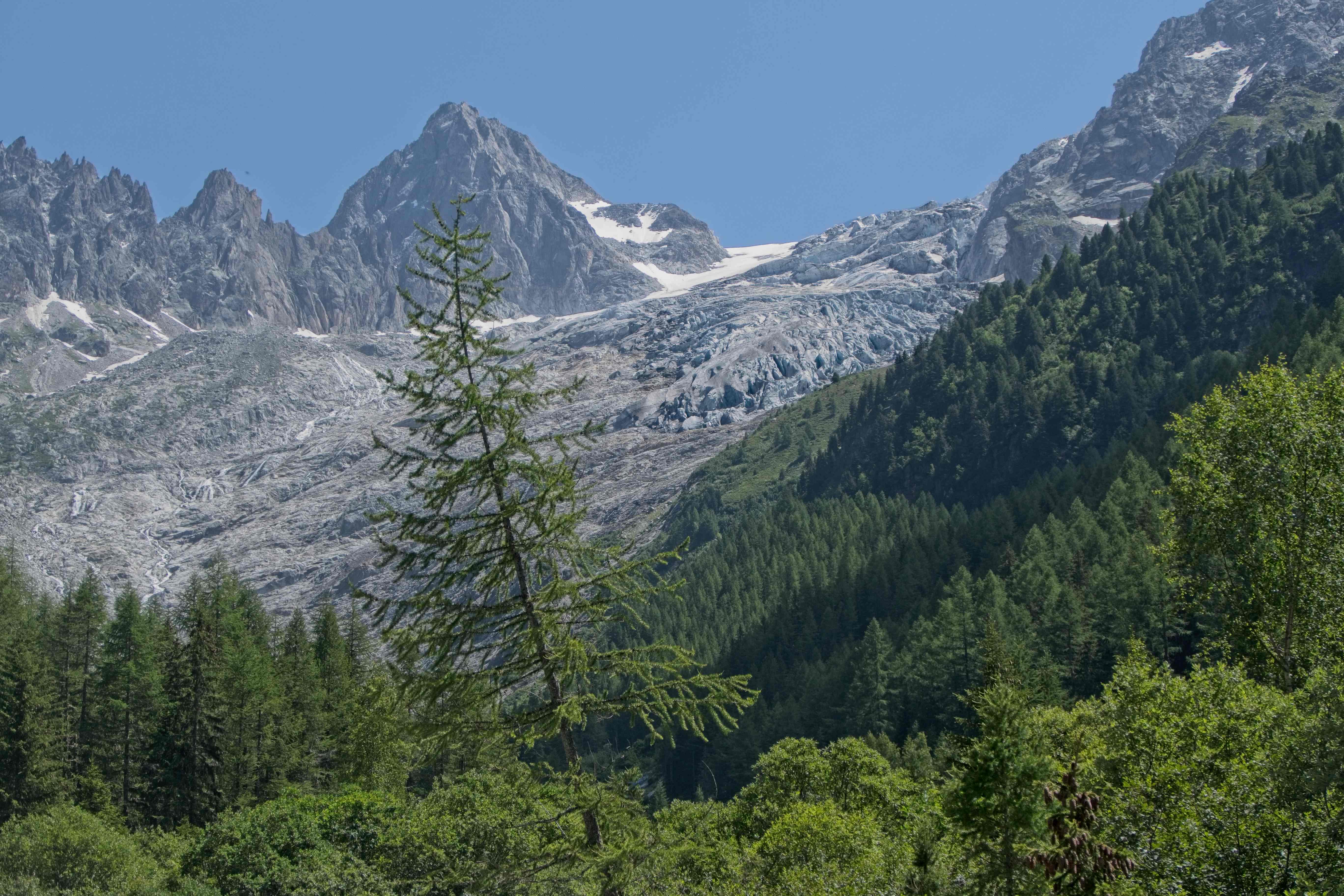Nach der Passhöhe fiel uns ein kleiner Campingplatz auf. Kurzerhand entschieden wir uns, dass wir hier anhalten und nach einer kleinen Wanderung die Nacht hier verbringen werden. Der Campingplatz in Le Peuty richtet sich hauptsächlich an Wanderer, die mit dem Zelt untwegs sind. Es hat ein öffentliches WC, einen Brunnen mit kaltem Bergbachwasser und überdachte Sitzplätze mit einer Grillstelle. Der Platz ist umgeben von hohen Bergen und den dichten Tannenwäldern. Wenn man Richtung Süden schaut, blickt man auf den Tentiergletscher.