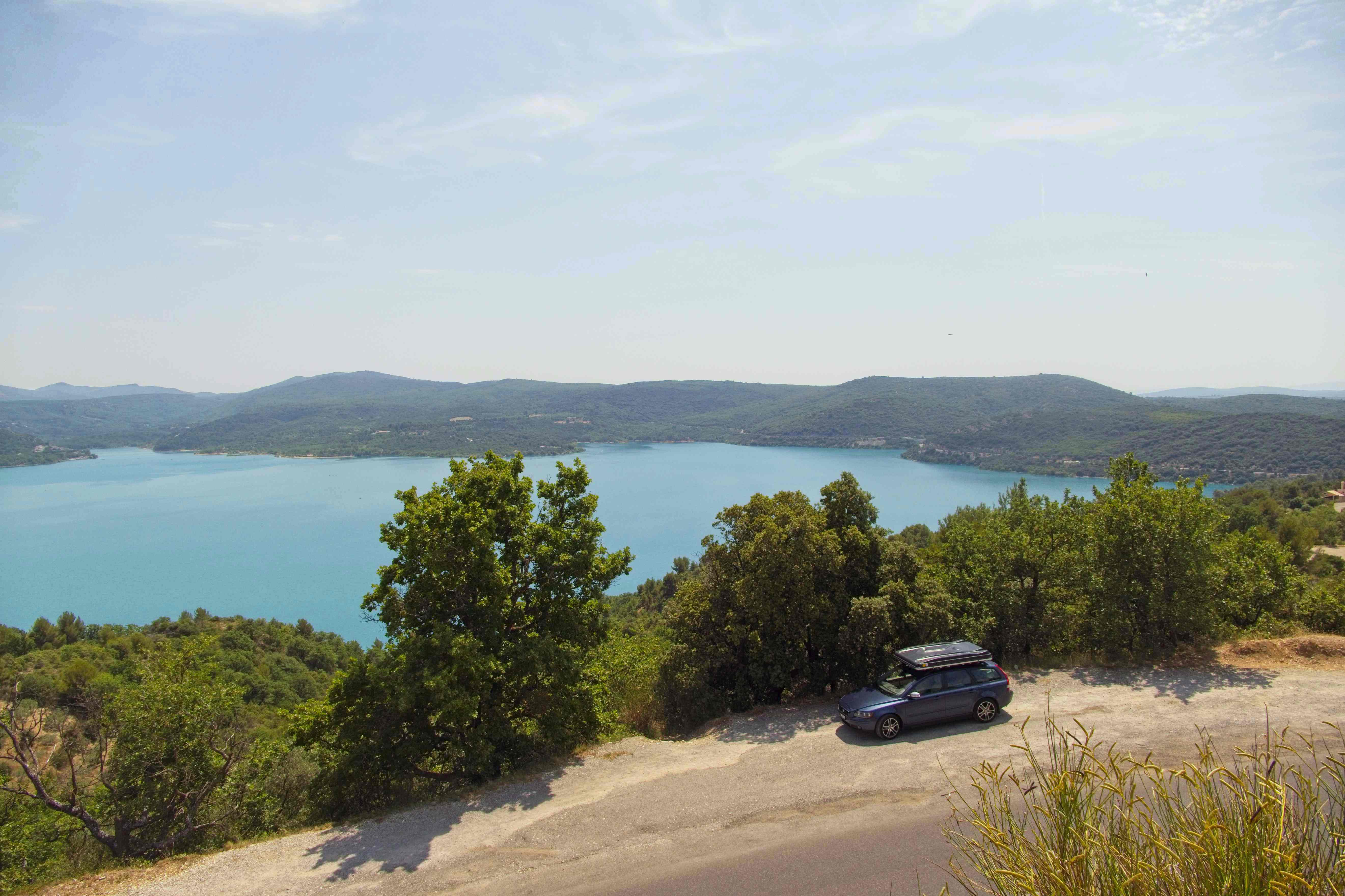 Bis uns dann ein azurblauer Fleck ins Auge sprang; unser heutiges Ziel: Der Lac de Sainte-Croix. Die Aussicht von dem Plateau auf dem wir uns befanden war unbeschreiblich. Das Wasser leuchtete strahlend blau zwischen den Felsküsten und den sandbraunen Städchen.