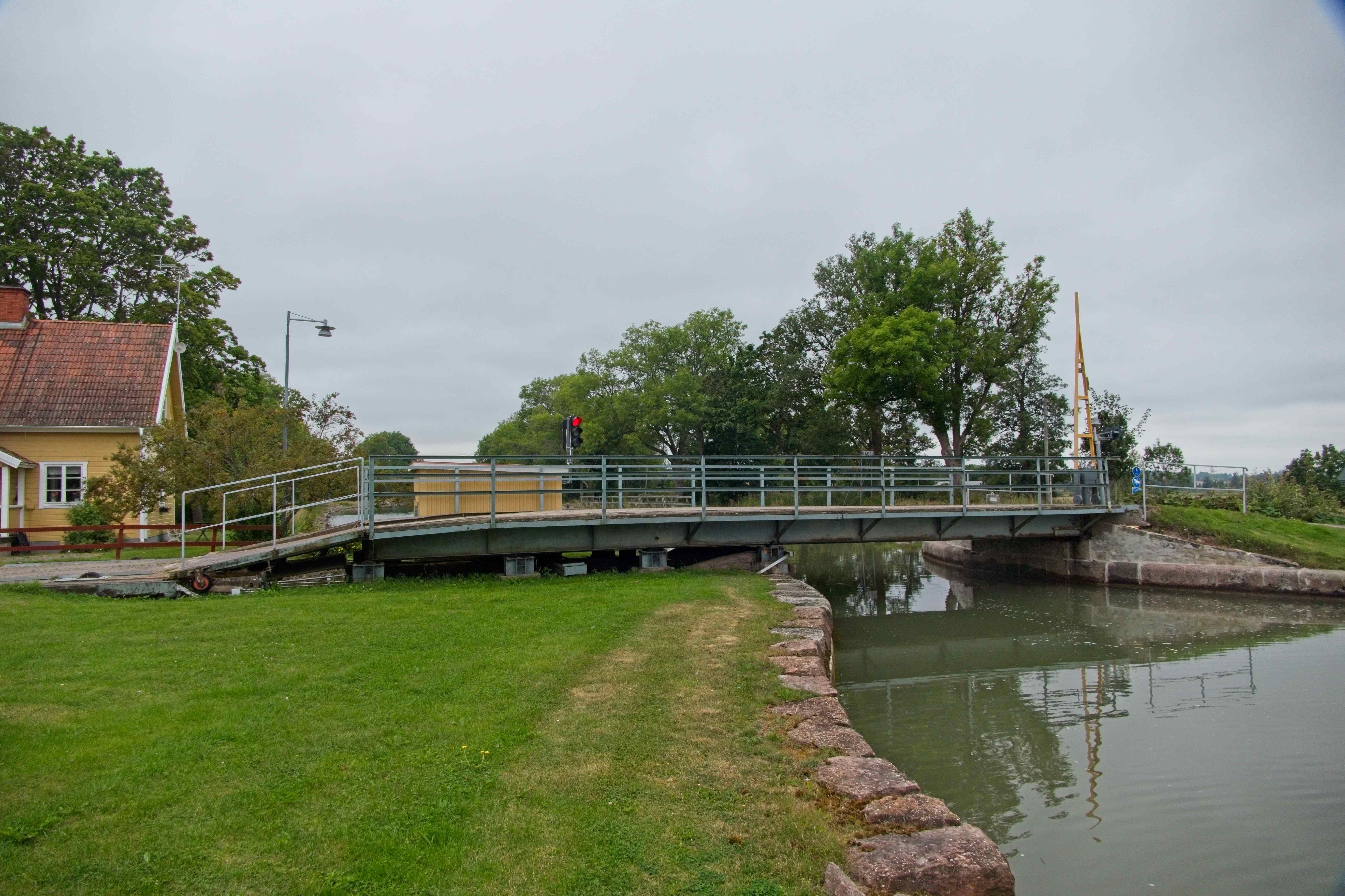 Rollbrücke und einer Schleuse des Götakanals. Eine Rollbrücke erfüllt denselben Zweck wie eine Zugbrücke, wird jedoch ziemlich simpel
