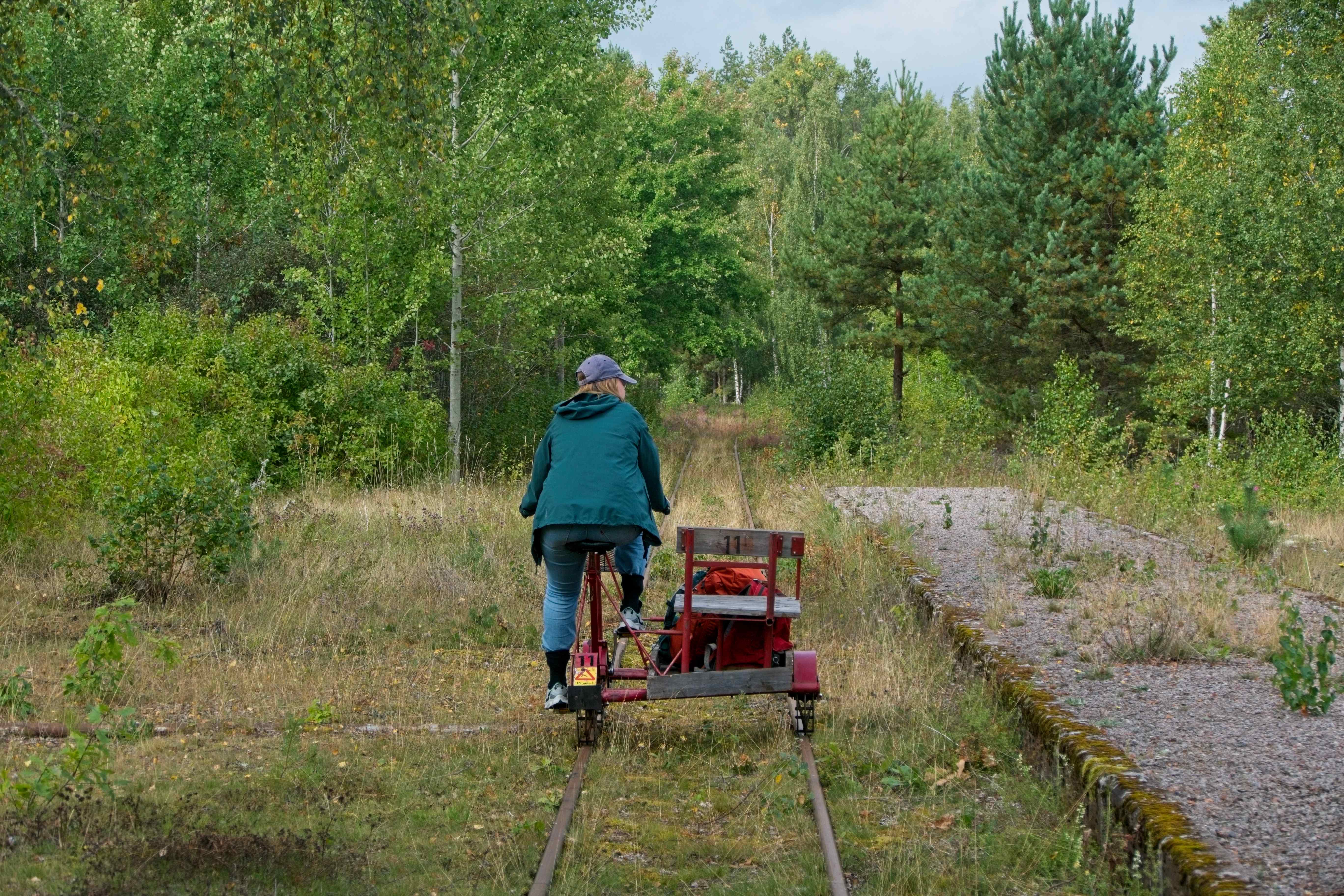 Ganz in der Nähe kann man auf stillgelegten Eisenbahnschienen mit einer Draisine fahren. Die Fahrt beginnt am Bahnhof Flaten, wo wir uns um 10 Uhr auf den Fahrradsattel der Draisine schwangen.